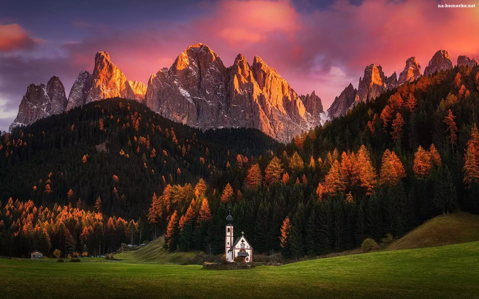 Kościół św. Jana, Zachód słońca, Włochy, Las, Dolina Val di Funes, Masyw Odle, Góry Dolomity na Komórkę |