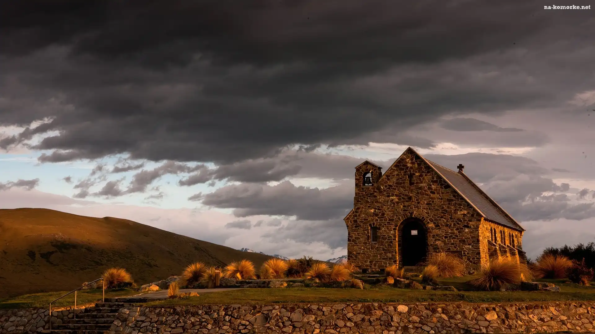 Kościół, Rośliny, Pola, Chmury na Komórkę