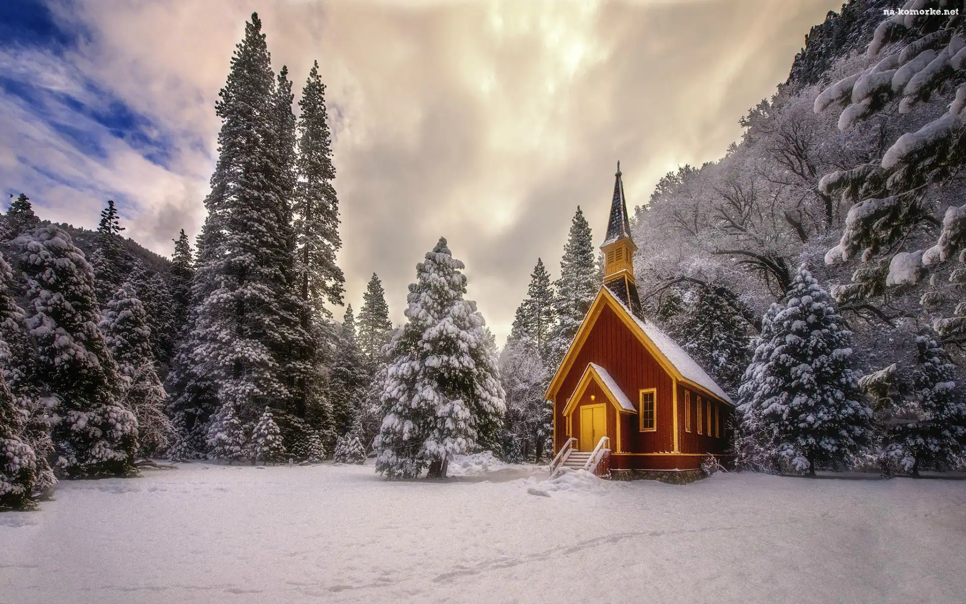 Drzewa, Zima, Las, Kaplica, Stany Zjednoczone, Świerki, Stan Kalifornia, Kościółek, Park Narodowy Yosemite na Komórkę |