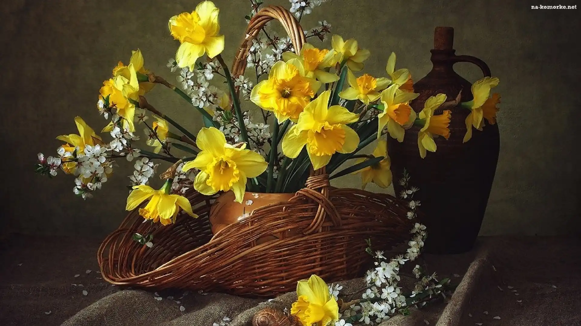 Kosz, Bukiet, Kwiaty, Żonkile, Koszyk na Komórkę