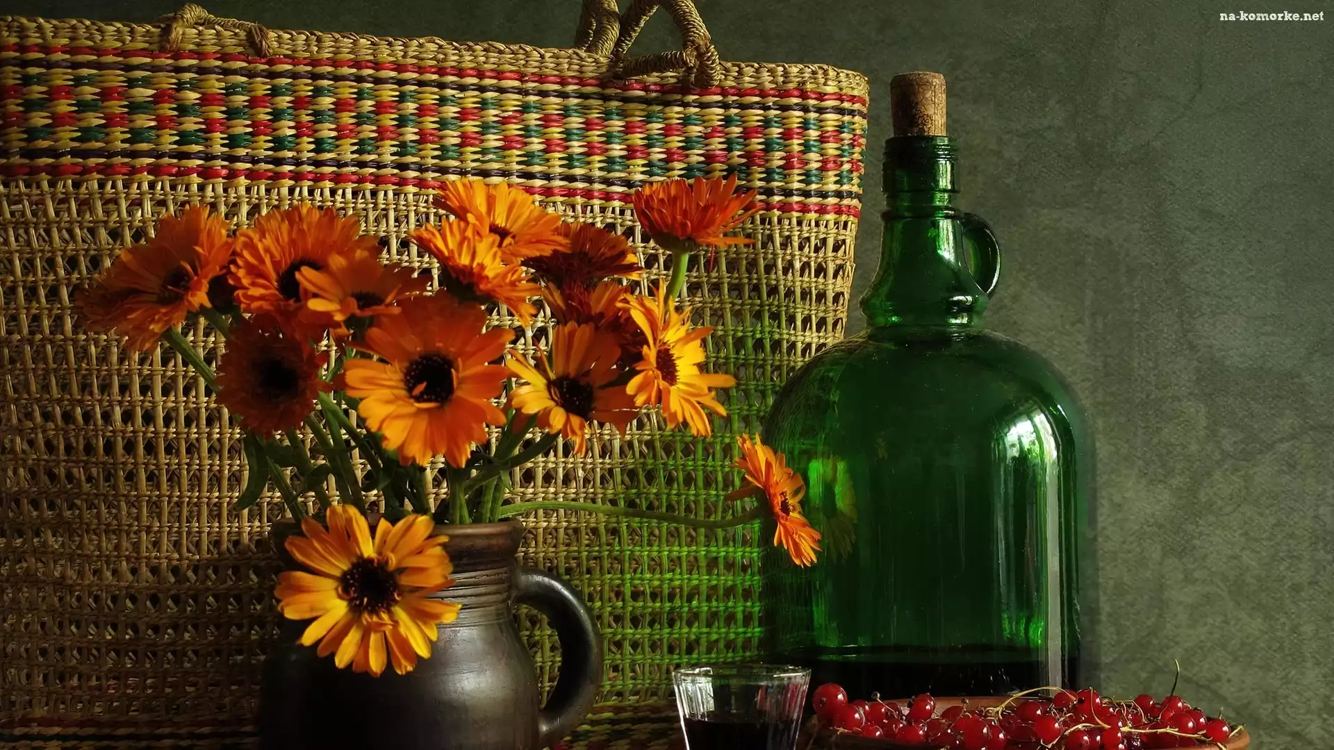 Kosz, Butelka, Pomarańczowe, Margerytki na Komórkę