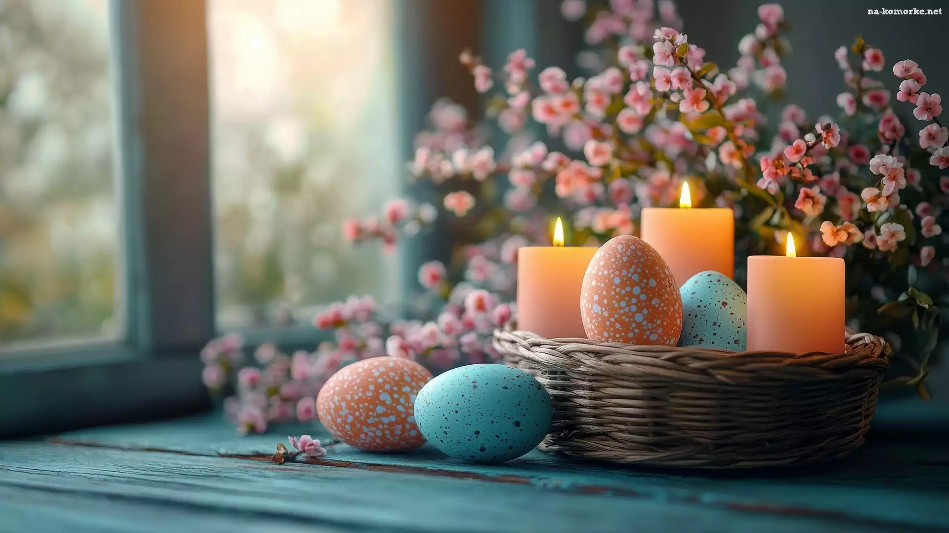 Kosz, Świece, Kwiaty, Trzy, Pisanki, Kolorowe, Wielkanoc, Płomienie, Różowe na Komórkę