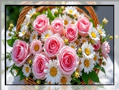 Wiklinowy, Kwiaty, Margerytki, Koszyk, Róże, Różowe na Komórkę