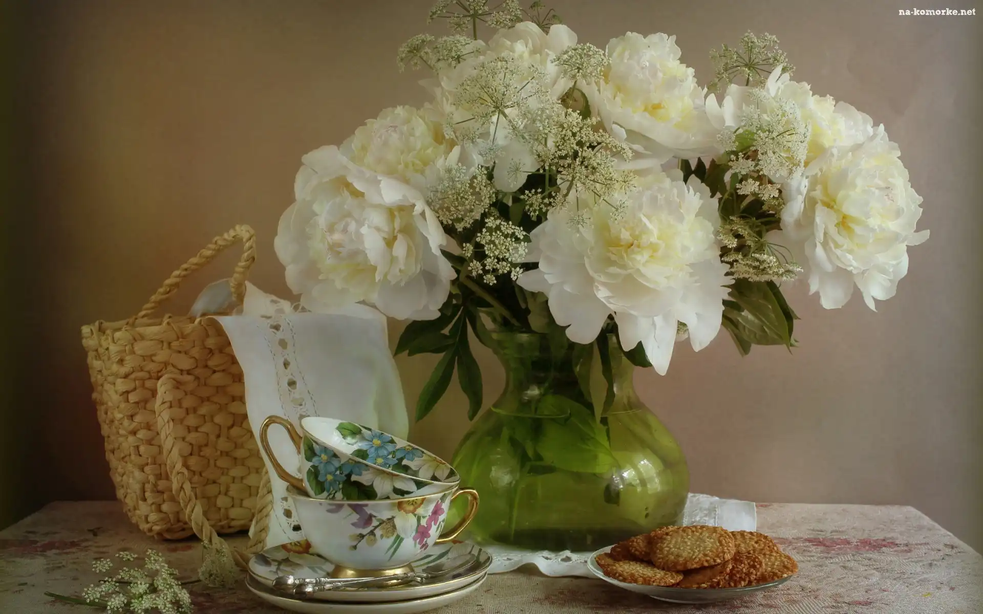Kwiaty, Koszyk, Wazon, Kompozycja, Piwonie, Ciasteczka, Filiżanka, Spodki na Komórkę