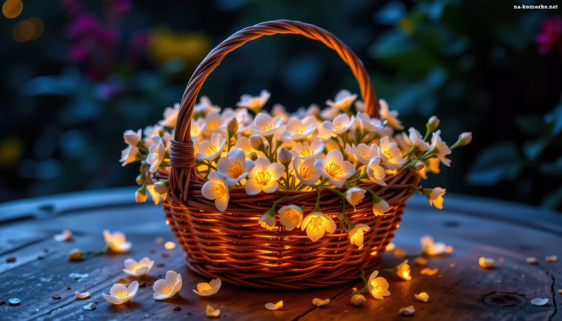 Kwiaty, Koszyk, Wiklinowy, Podświetlone, AI na Komórkę