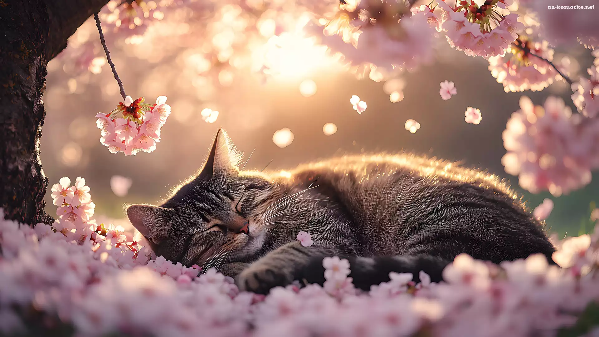 Śpiący, Kwiaty, Drzewo, Kot, Słoneczny blask na Komórkę