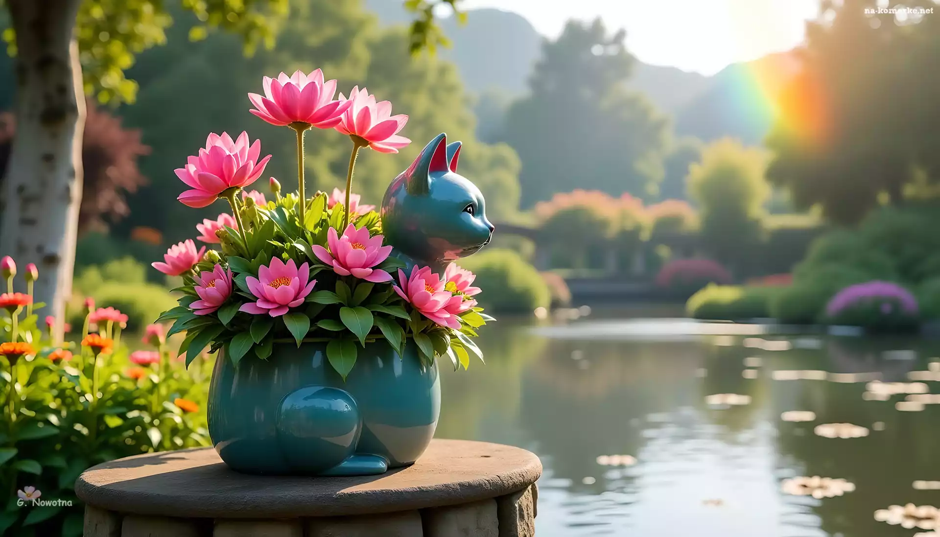 Doniczka, Kot, Jezioro, Kwiaty, Grafika na Komórkę