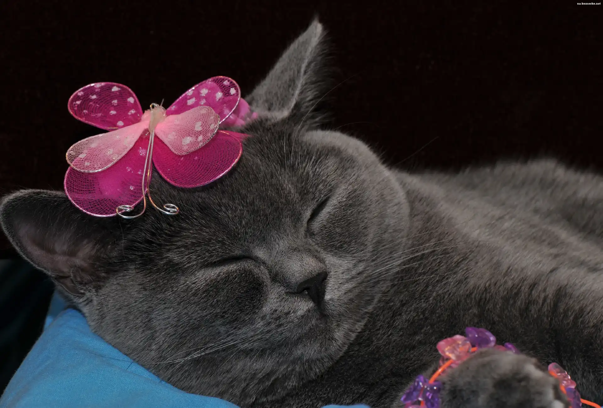 Kot, Kocyk Kotek, Kłębki, Wełny Rosyjski, Niebieski Kot, Rosyjski, Niebieski Śpiący, Motylek, Kot, Spinka Koty Rosyjskie Kot, Rosyjski, Niebieski Oczy, Głowa, Kota, Duże, Żółte