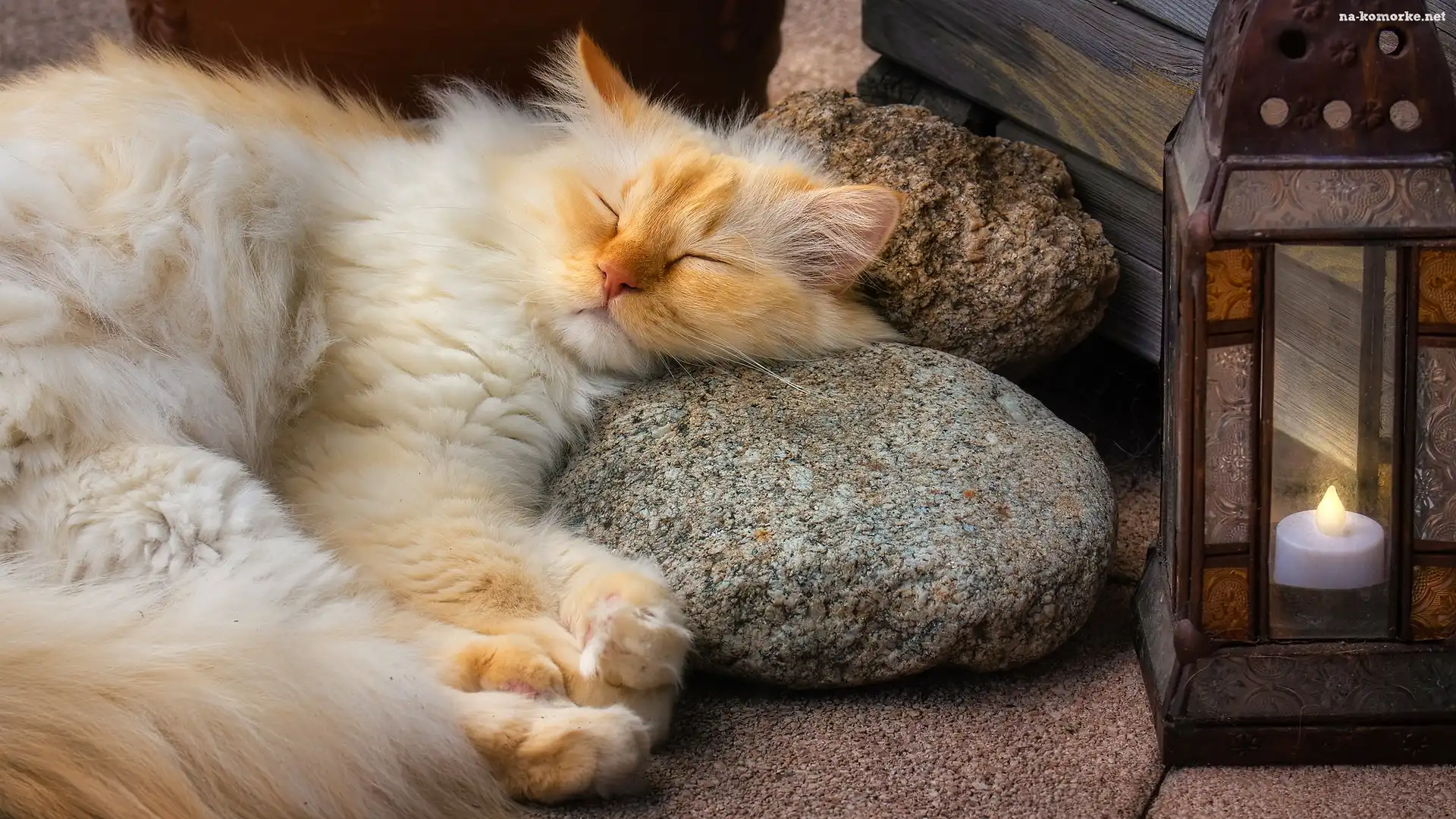 Kot, Rudy, Śpiący, Lampion, Niebieskooki, Kamienie na Komórkę