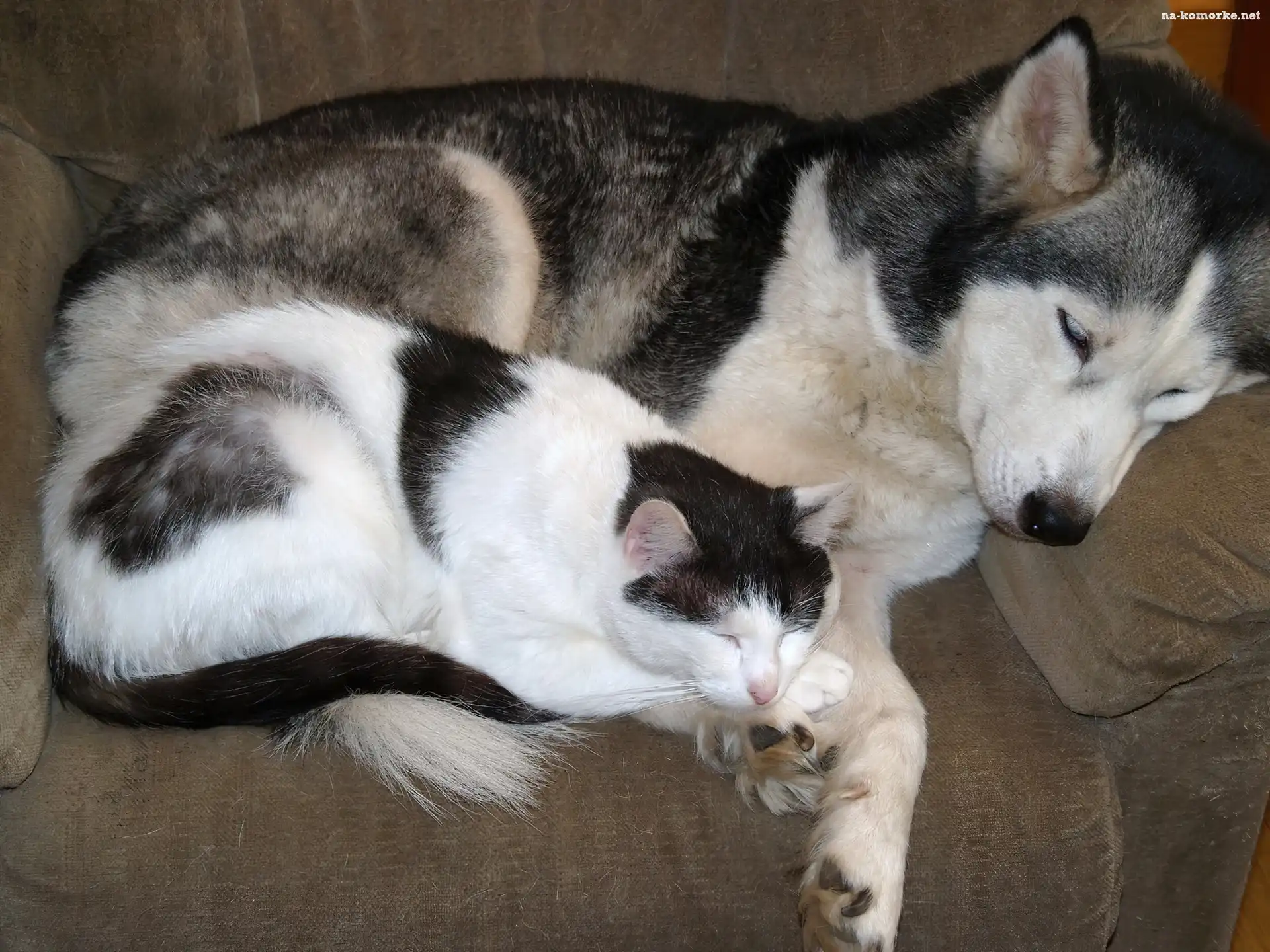 Śpiący, Siberian Husky, Kot, Pies na Komórkę