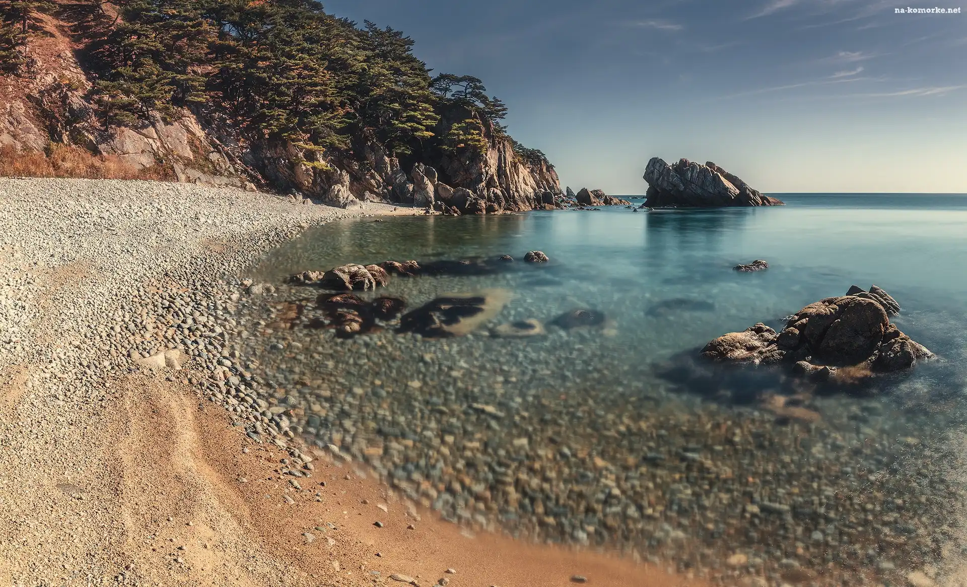 Morze Japońskie, Kraj Nadmorski, Drzewa, Rosja, Skały, Kamienie, Piasek, Zatoka Telyakovskogo na Komórkę |