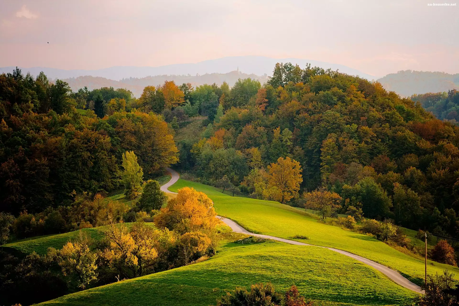 Krajobraz, Jesień, Droga, Drzewa, Pagórki na Komórkę