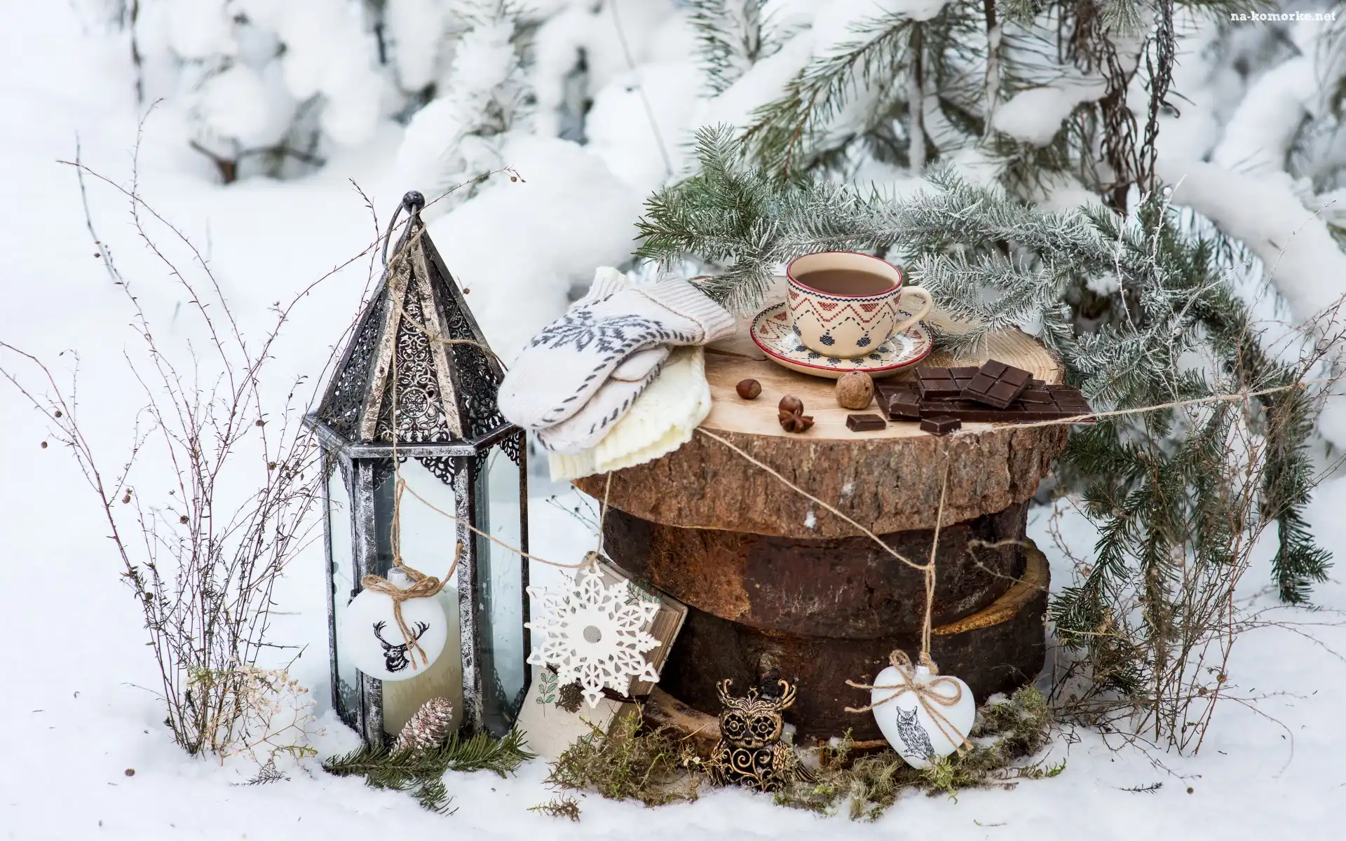 Krążki, Kompozycja, Świąteczna, Śnieg, Filiżanka, Zima, Pnia, Rośliny, Iglak, Lampion, Herbata, Rękawiczki, Czekolada na Komórkę |