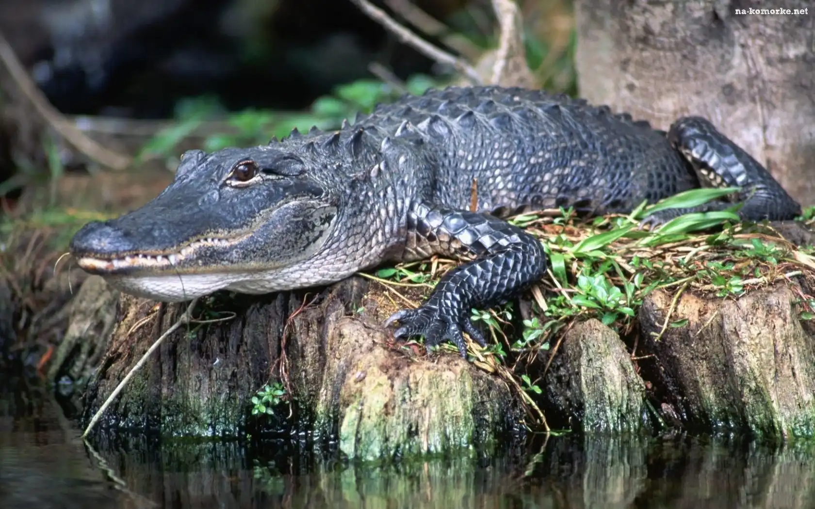 Krokodyl, Woda, Skała, Trawy na Komórkę