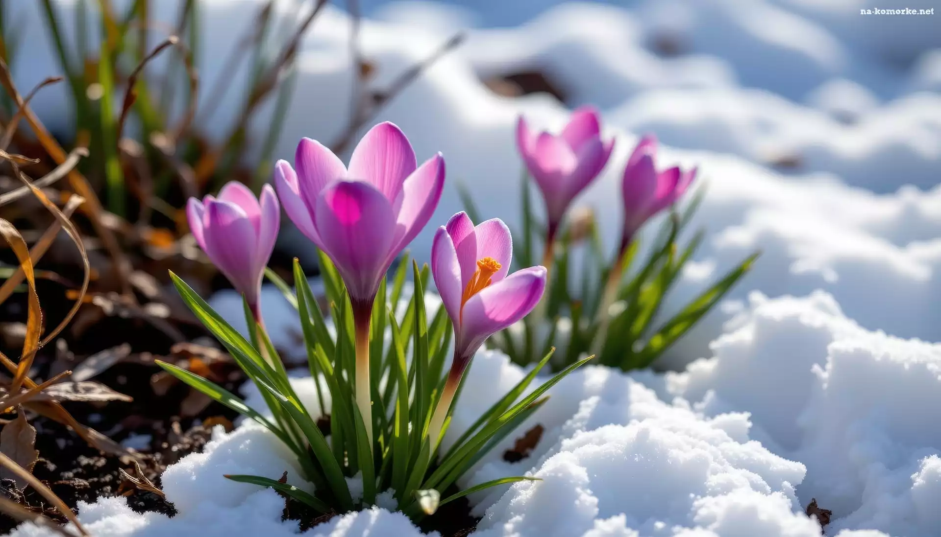 Fioletowe, Kwiaty, Śnieg, Krokusy, Grafika AI na Komórkę