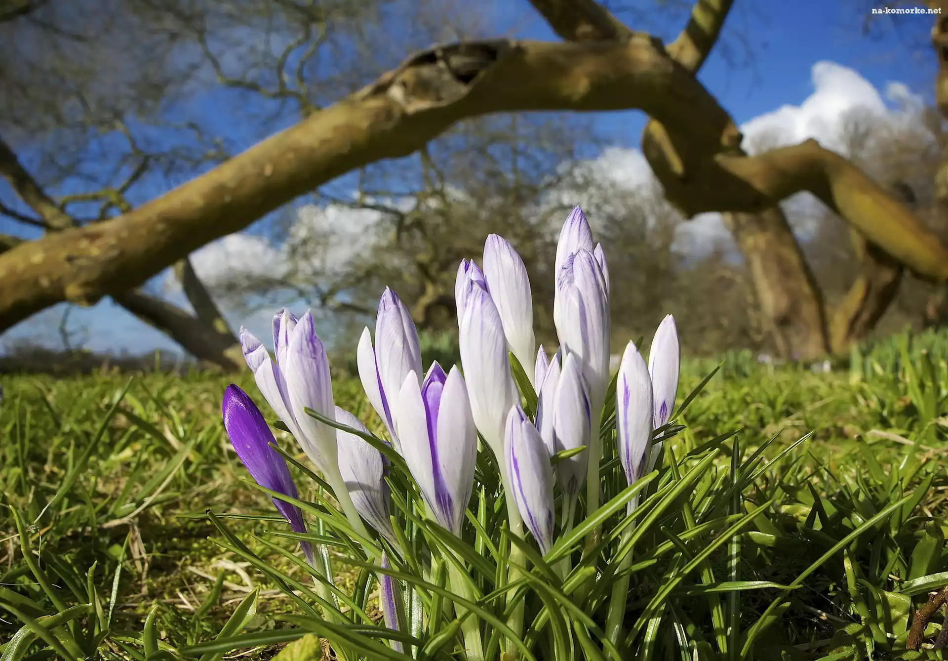 Krokusy, Drzewa, Trawa, Konar na Komórkę