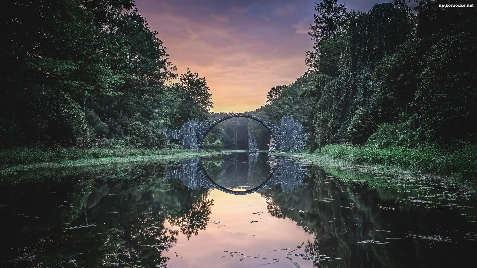 Jezioro Rakotz, Most łukowy, Drzewa, Kamienny, Park Rododendronów Kromlau, Saksonia, Niemcy, Most Diabła, Zielone na Komórkę |