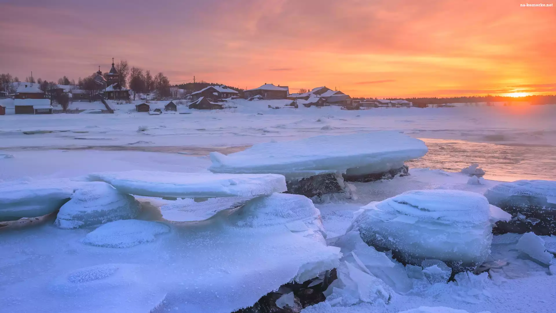 Zachód słońca, Zima, Kry, Zabudowania, Oblodzone, Rzeka na Komórkę