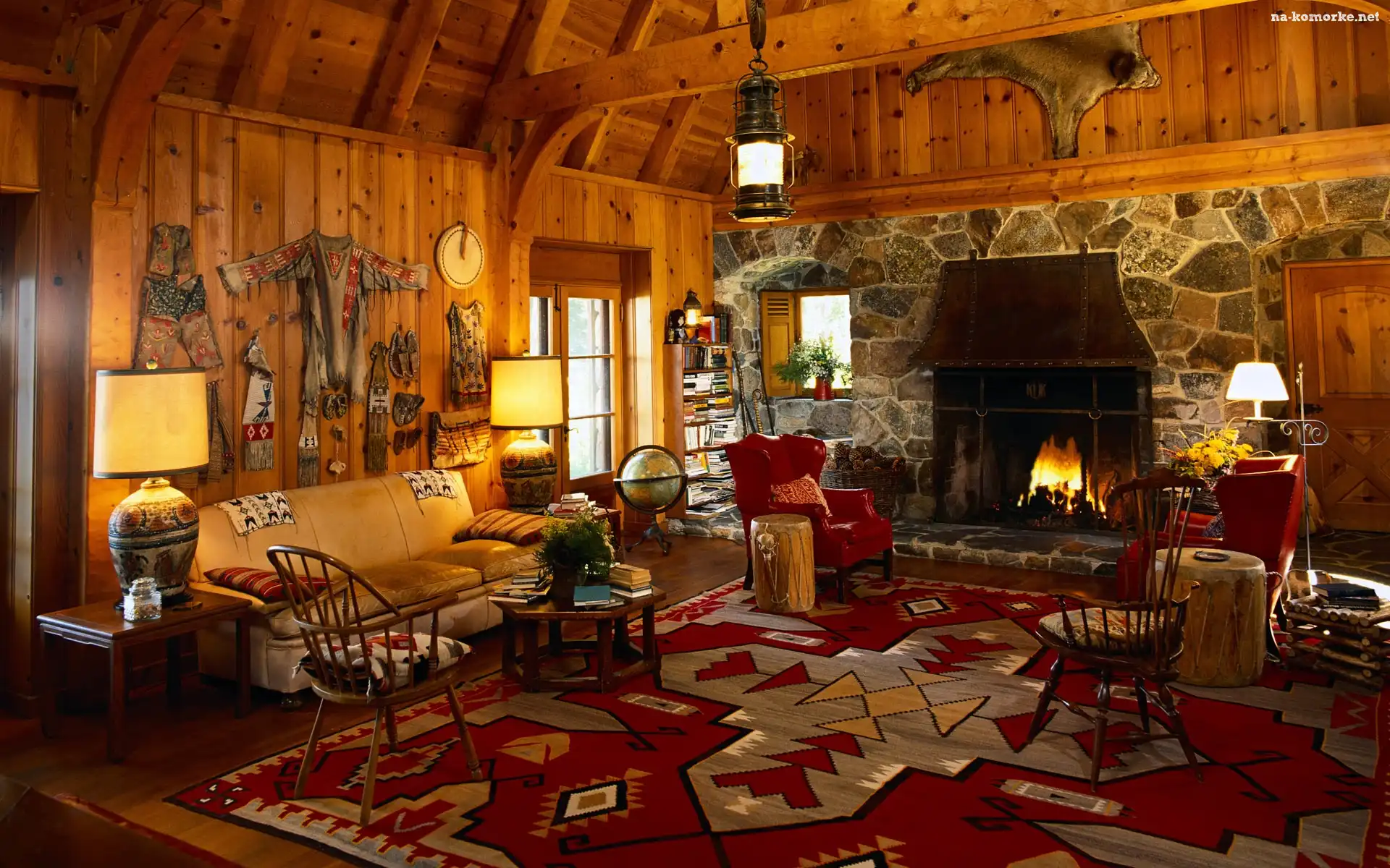 Krzesła, Kominek, Pokój, Globus, Kanapa, Dywan na Komórkę