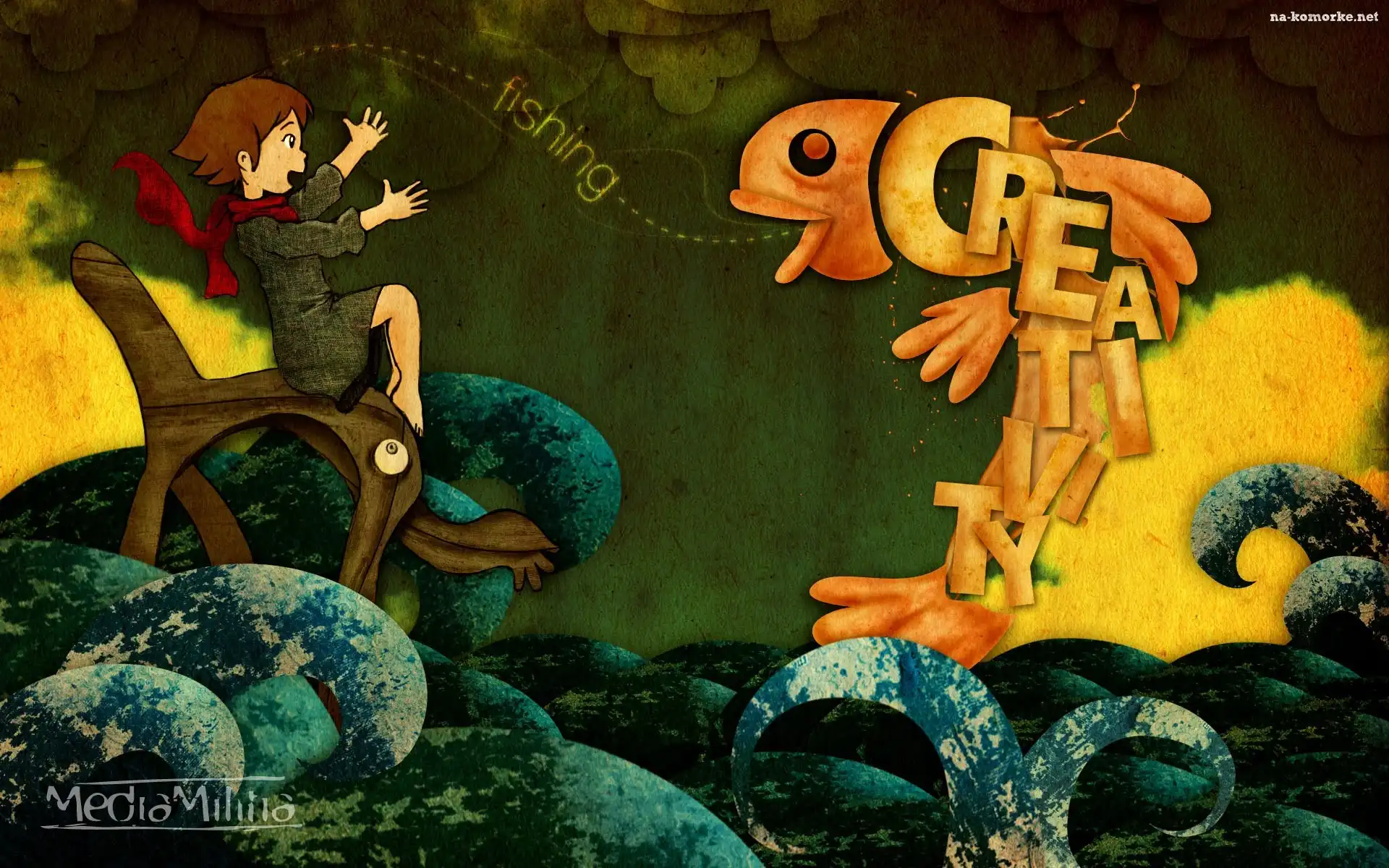 Napisy, Krzesło, Dziewczynka, Grafika 2D, Ryba, Fale na Komórkę