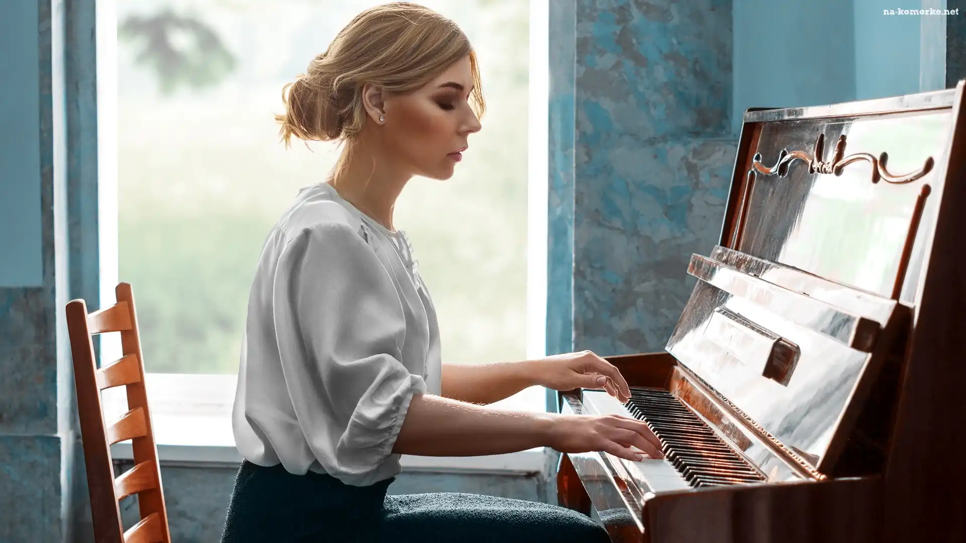 Krzesło, Kobieta, Blondynka, Pianino, Okno na Komórkę