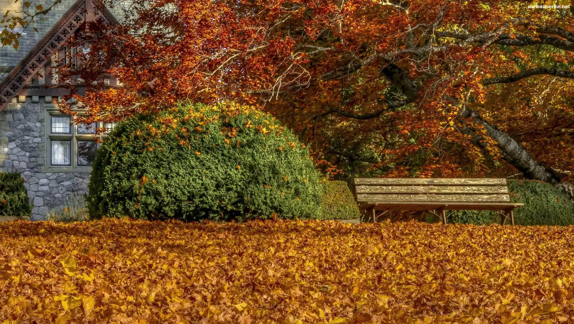 Krzew, Dom, Jesień, Liście, Drzewa, Ławka na Komórkę