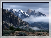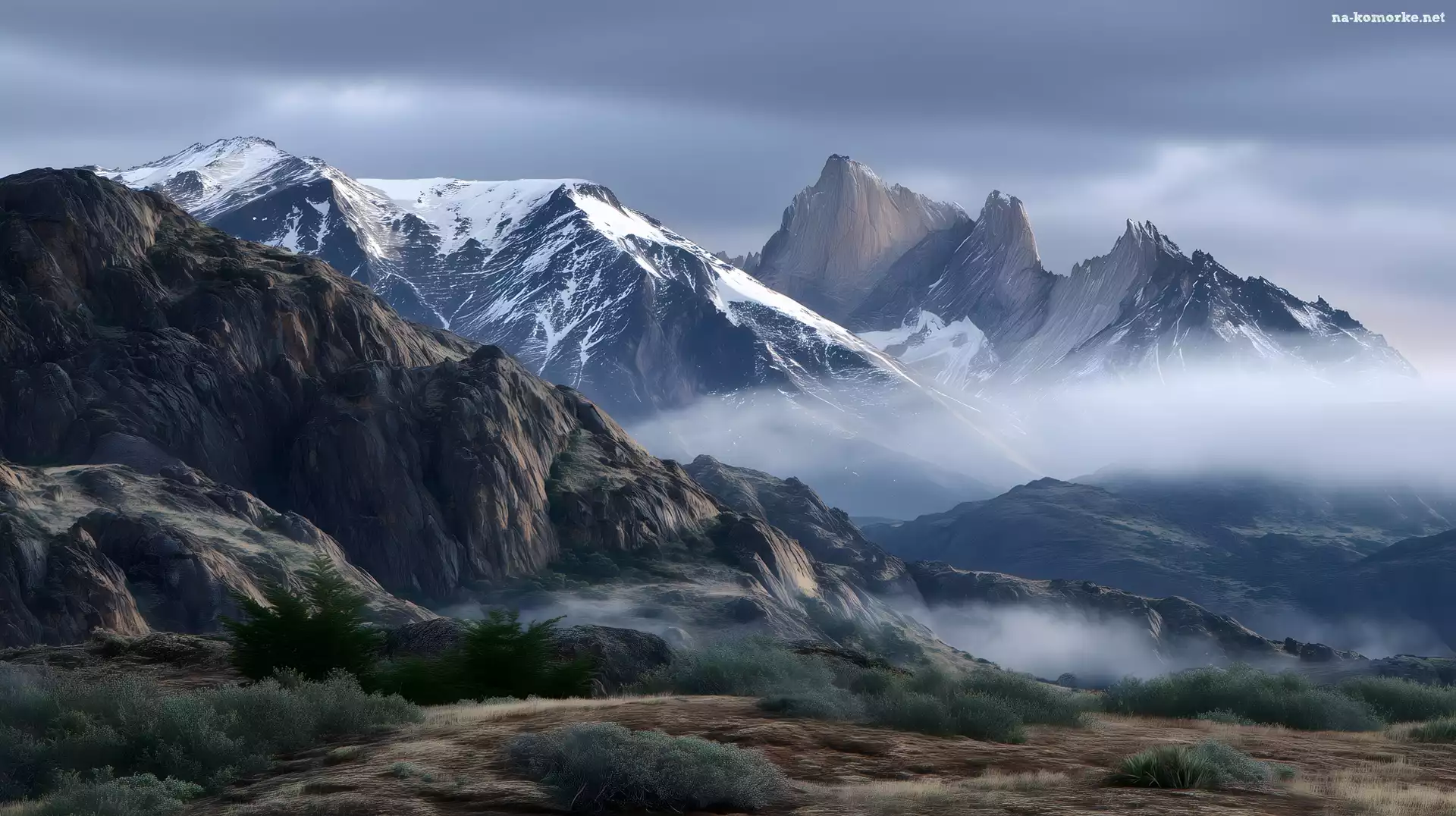 Zima, Góry, Mgła, Krzewy, Grafika AI na Komórkę