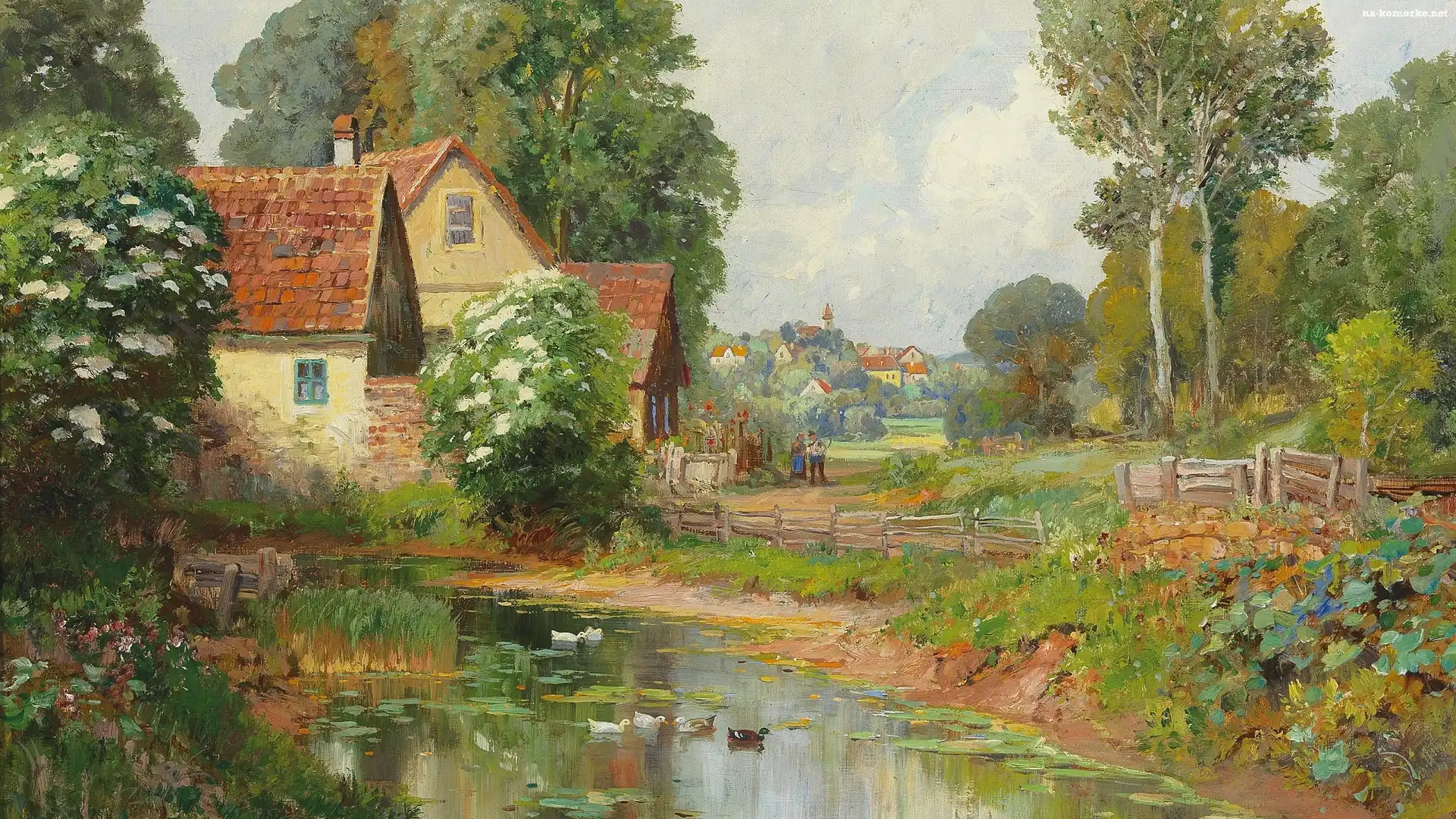 Obraz, Wieś, Krzewy, Malarstwo, Drzewa, Dom, Alois Arnegger, Wiosna, Staw, Kaczki na Komórkę