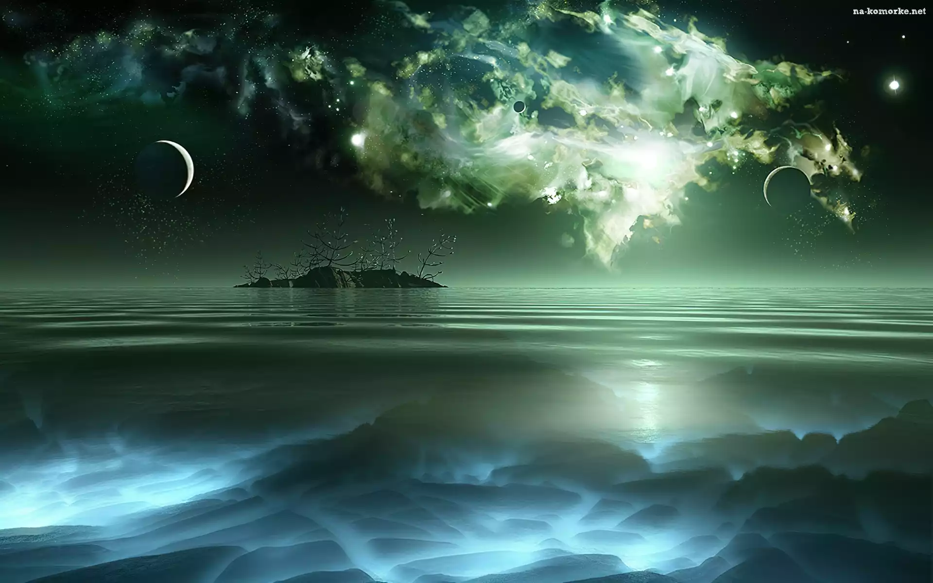Krzewy, Skały, Podwodne, Chmury, Wysepka, Gwiazdy na Komórkę