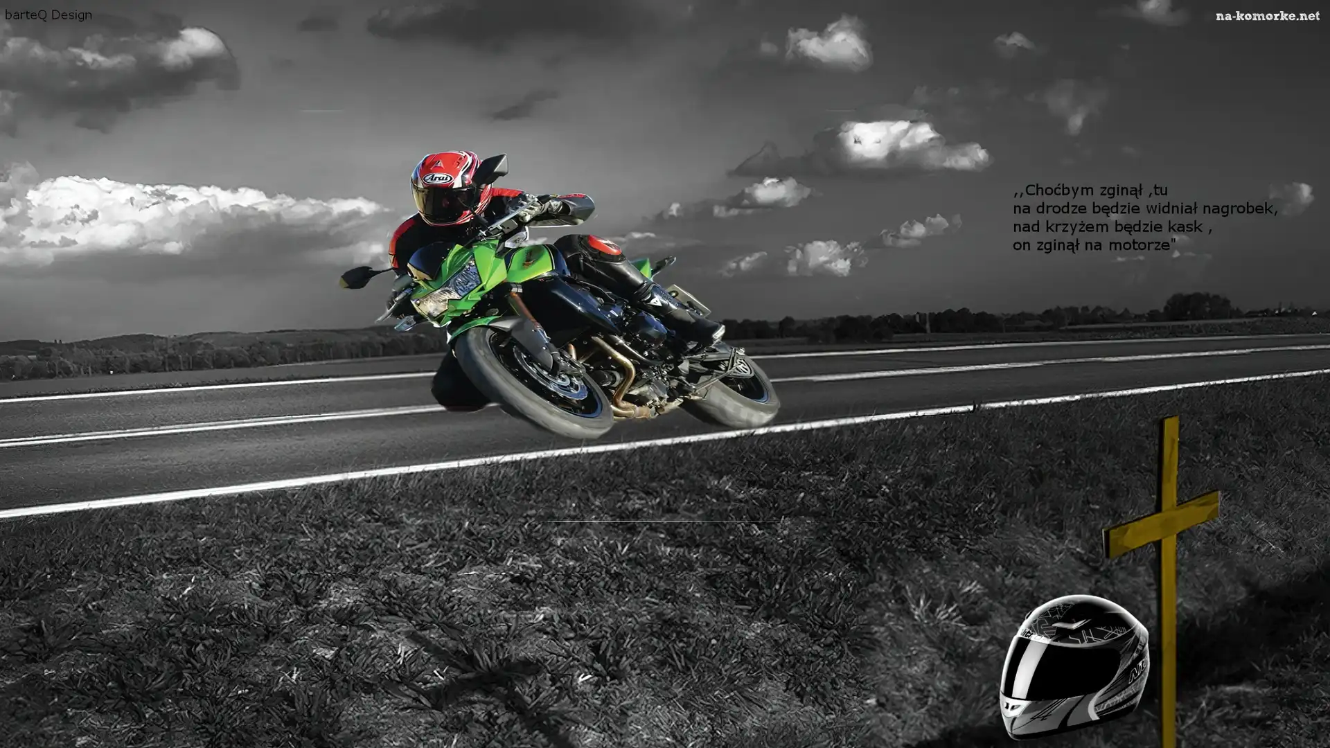 Krzyż, Droga, Kask, Motocyklista na Komórkę