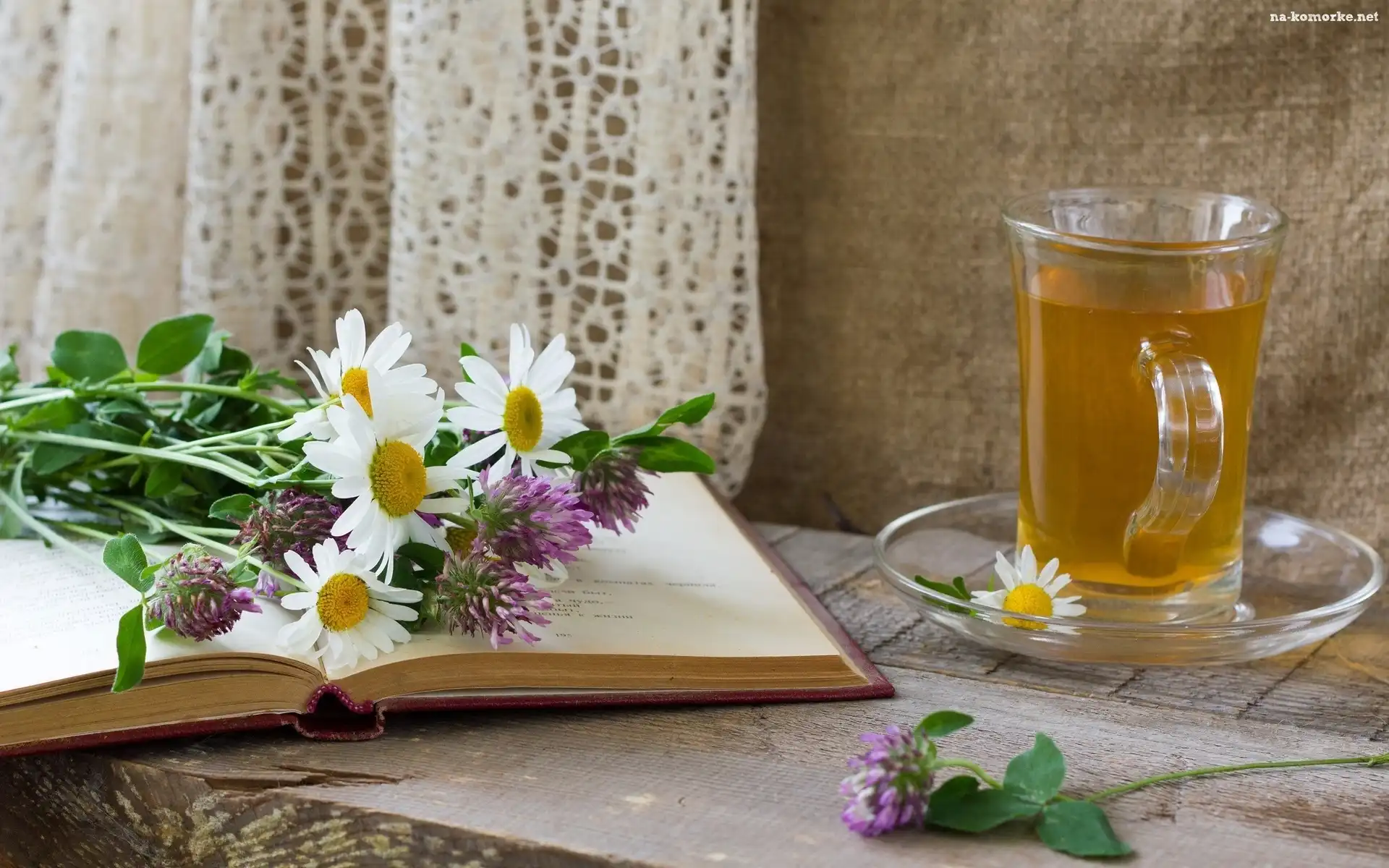 Filiżanka, Książka, Okno, Herbaty, Bukiet, Polnych, Kwiatów na Komórkę