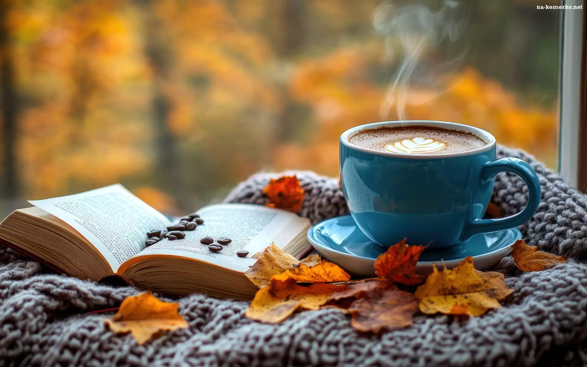 Szal, Liście, Filiżanka, Pożółkłe, Kawa, Kompozycja, Książka, Ziarna, Spodek, Grafika AI na Komórkę |