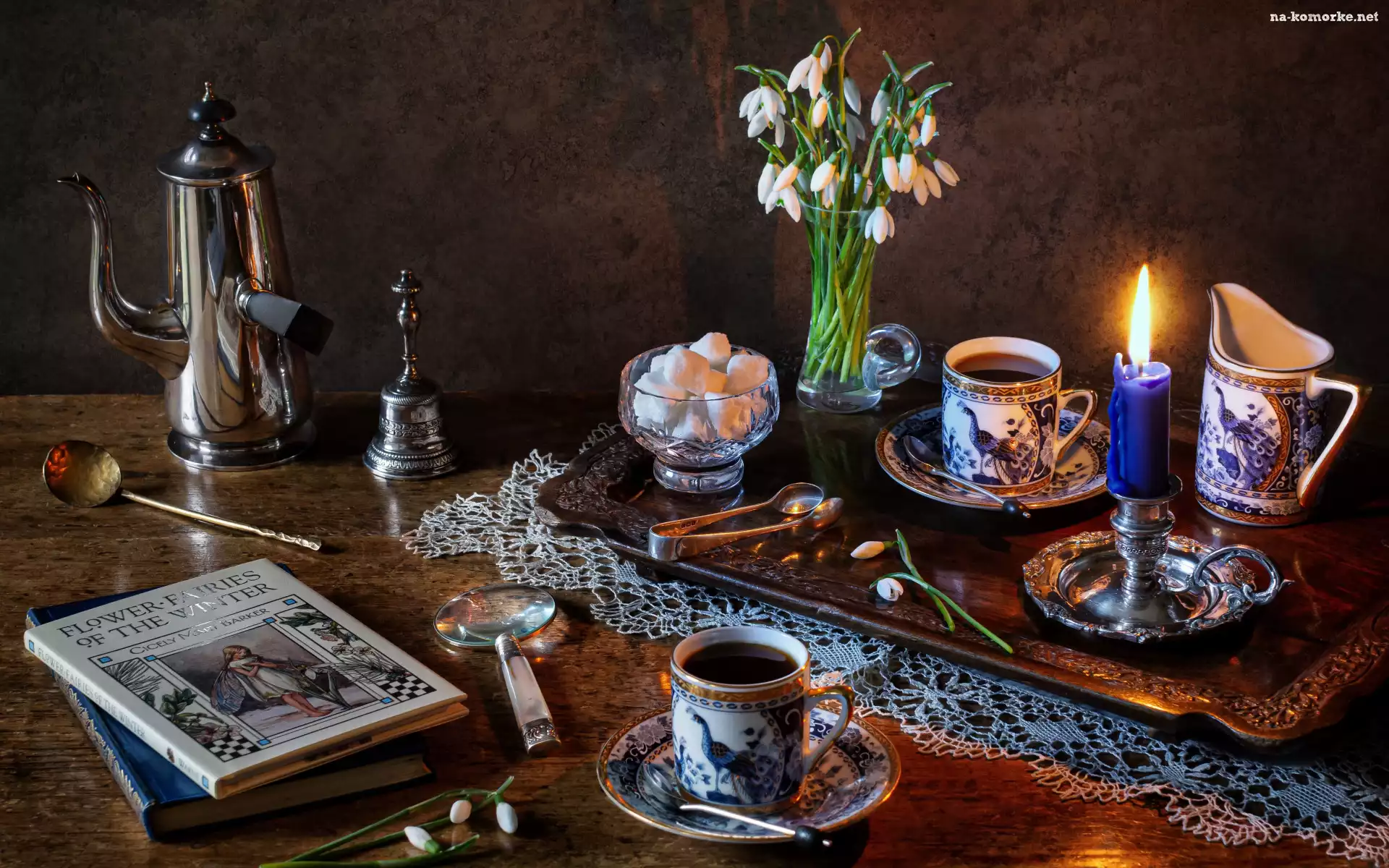 Książki, Świeca, Przebiśniegi, Dzbanek, Taca, Kwiaty, Kawa, Czajnik, Filiżanki, Kompozycja na Komórkę |