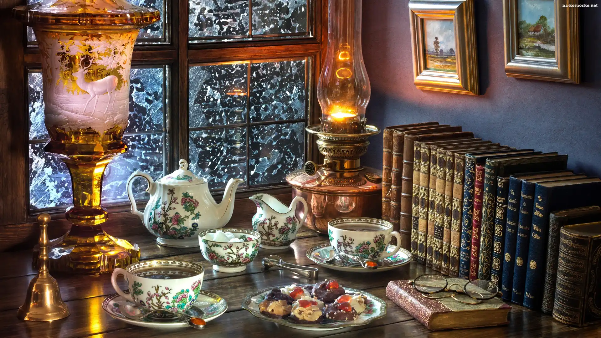 Zastawa, Książki, Filiżanki, Okno, Stołowa, Kawa, Czajnik, Lampy na Komórkę
