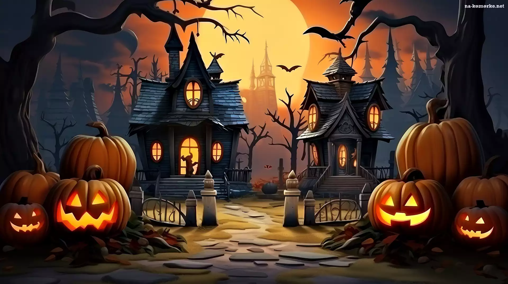 Dynie, Księżyc, Halloween, Domy, Grafika na Komórkę