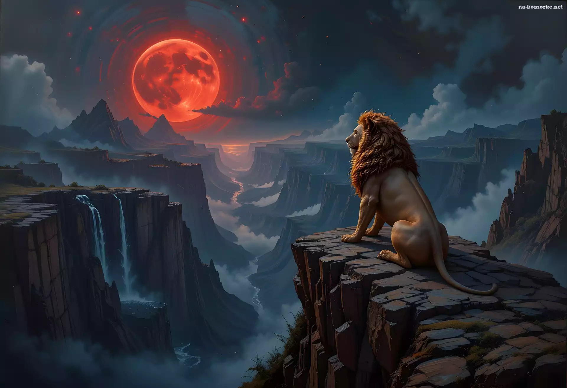 Lew, Księżyc, Kanion, Skały, Wodospady na Komórkę
