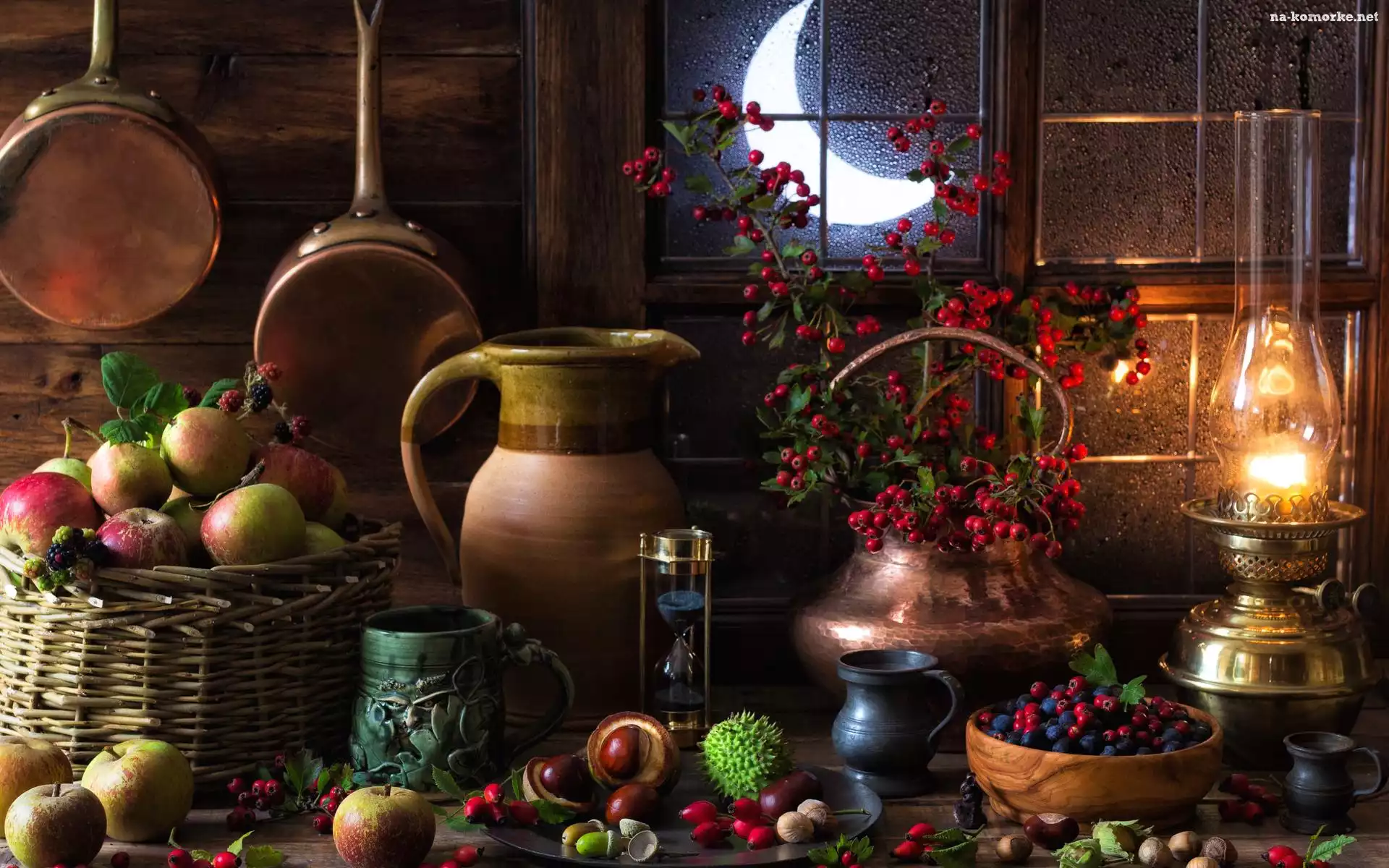 Kompozycja, Księżyc, Okno, Dzban, Patelnie, Lampa, Naftowa na Komórkę