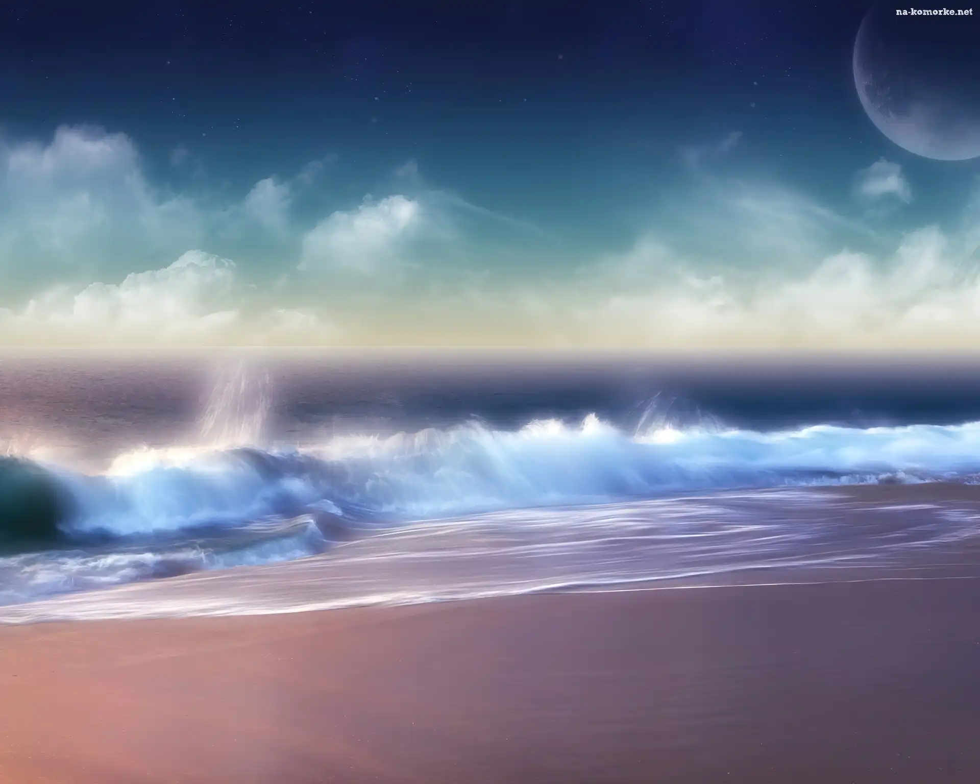 Księżyc, Morze, Fale, Plaża, Chmury na Komórkę