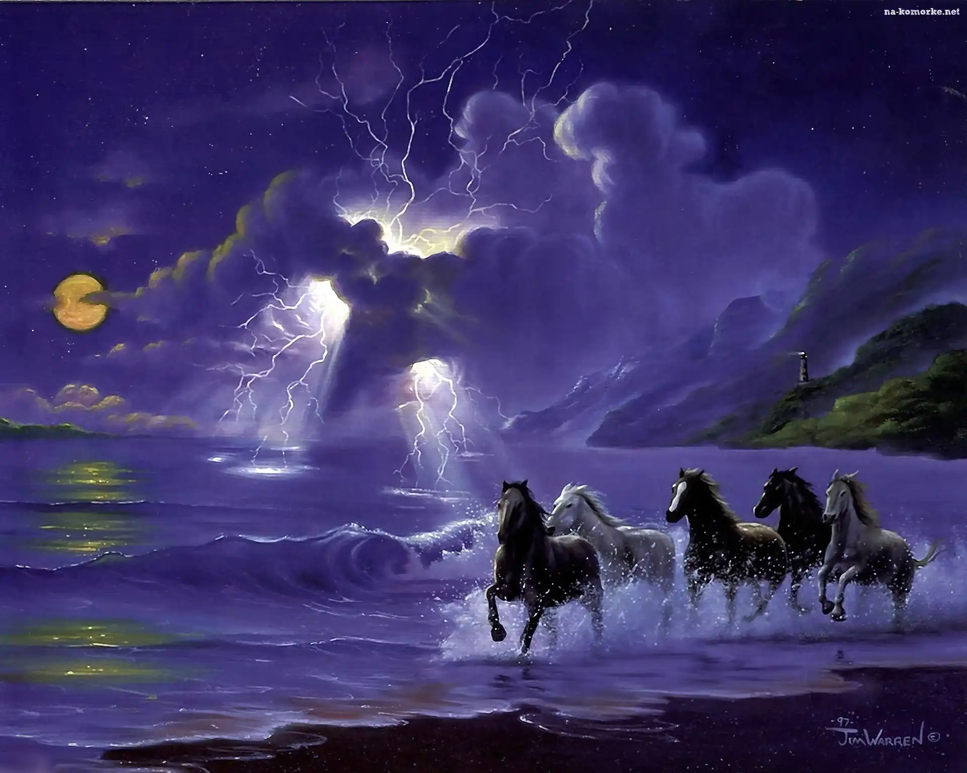 Księżyc, Konie, Morze, Plaża, Noc na Komórkę