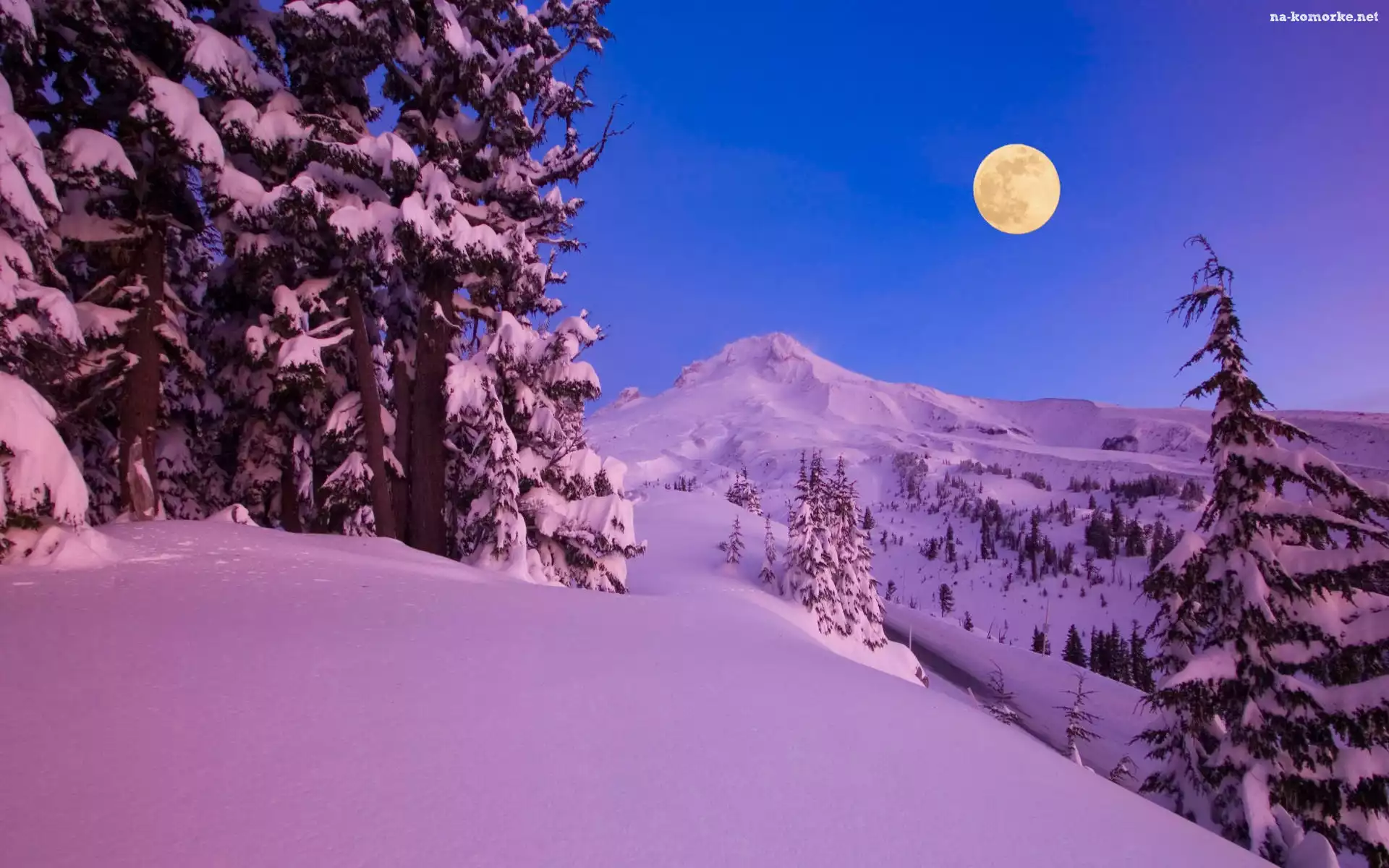 Ksieżyc, Góry, Drzewa, Pokryte, Śniegiem na Komórkę