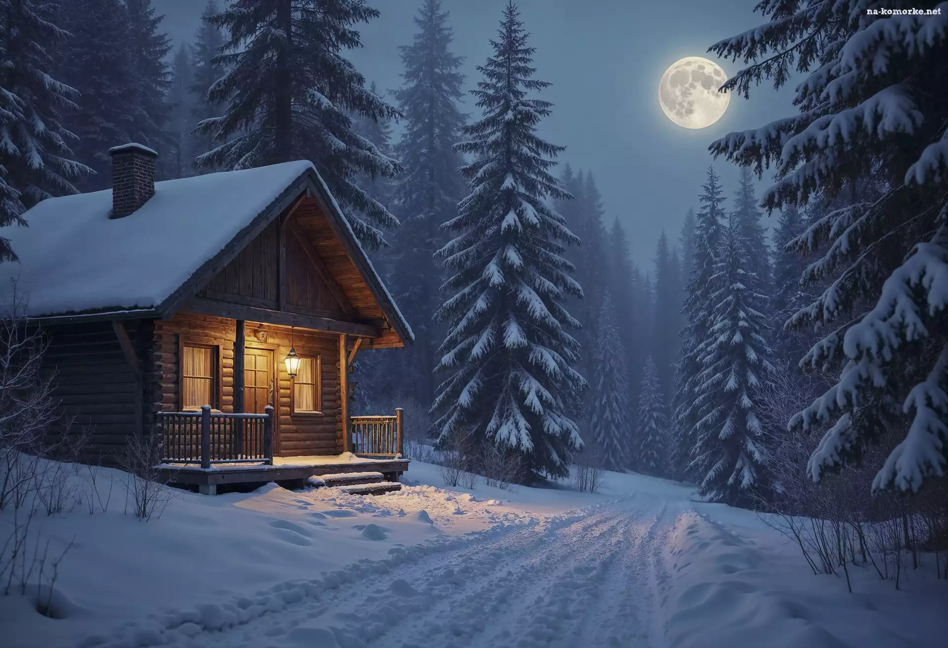 Dom, Księżyc, Zima, Las, Droga na Komórkę