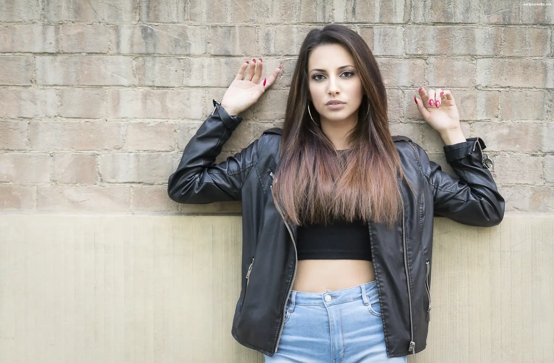 Kobieta, Kurtka, Dżinsy, Szatynka, Długie, Włosy, Skórzana na Komórkę