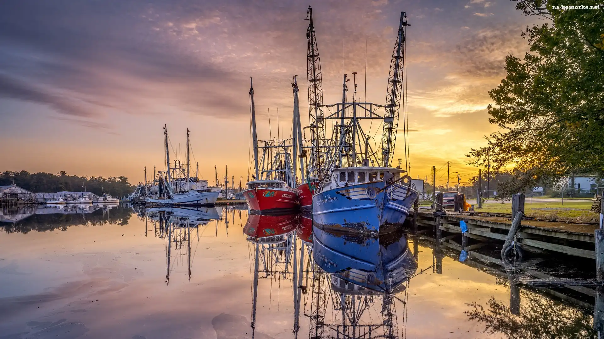 Drzewa, Kutry, Przystań, Chmury, Statki rybackie, Wschód słońca na Komórkę