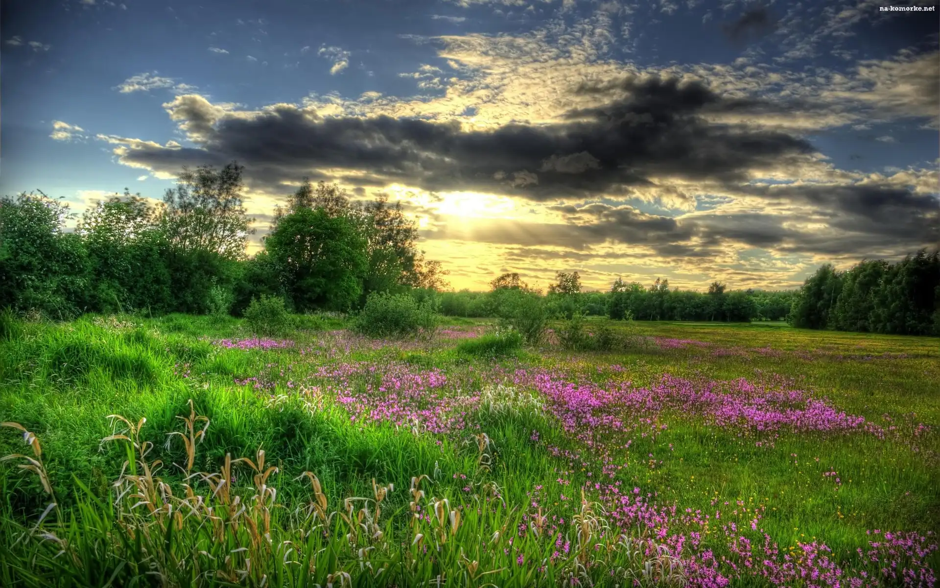Kwiatki, Zachód, Słońca, Łąka, Drzewa na Komórkę