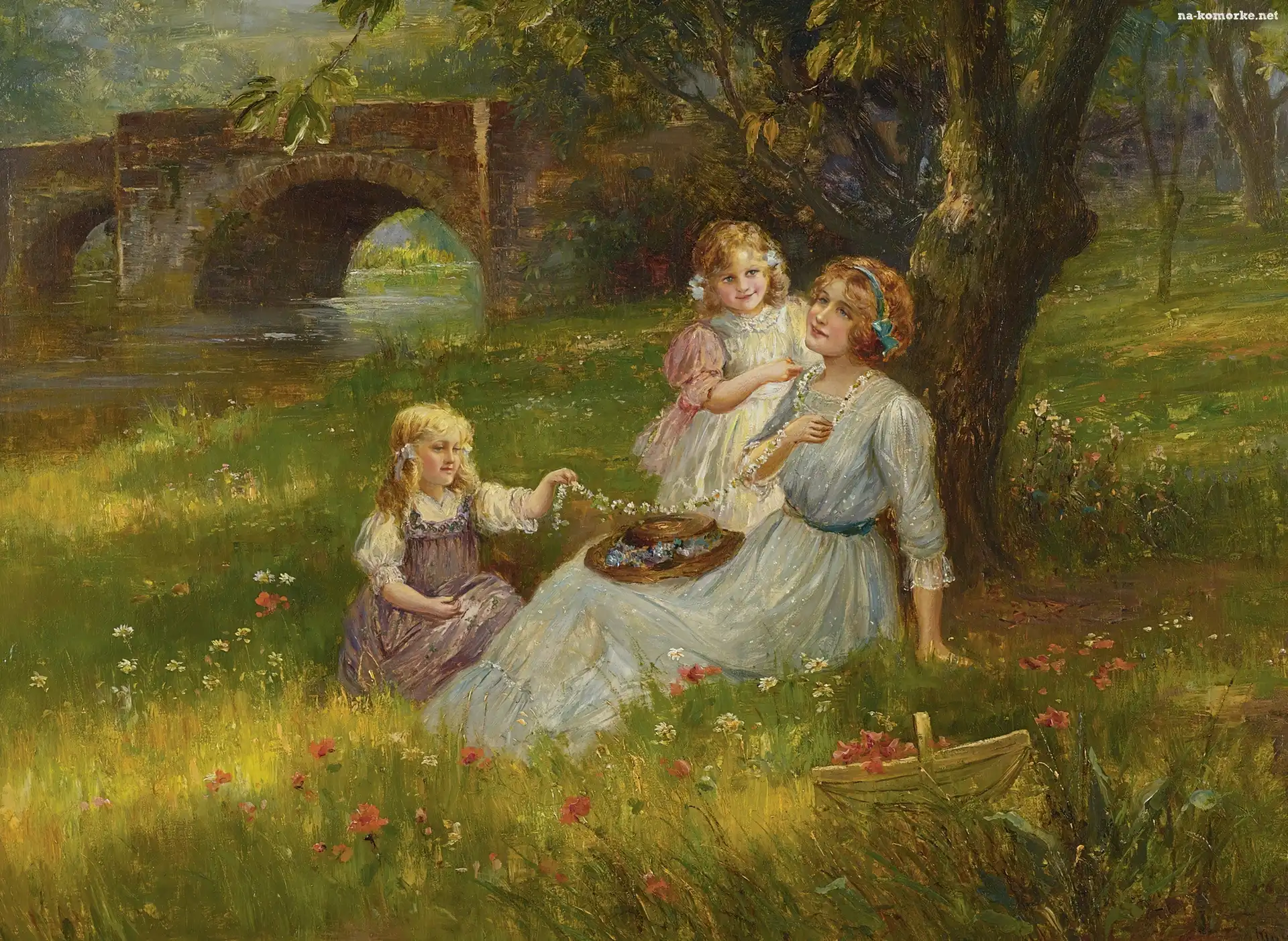 Kwiatki, Kobieta, Dwie, Dziewczynki, Łąka na Komórkę