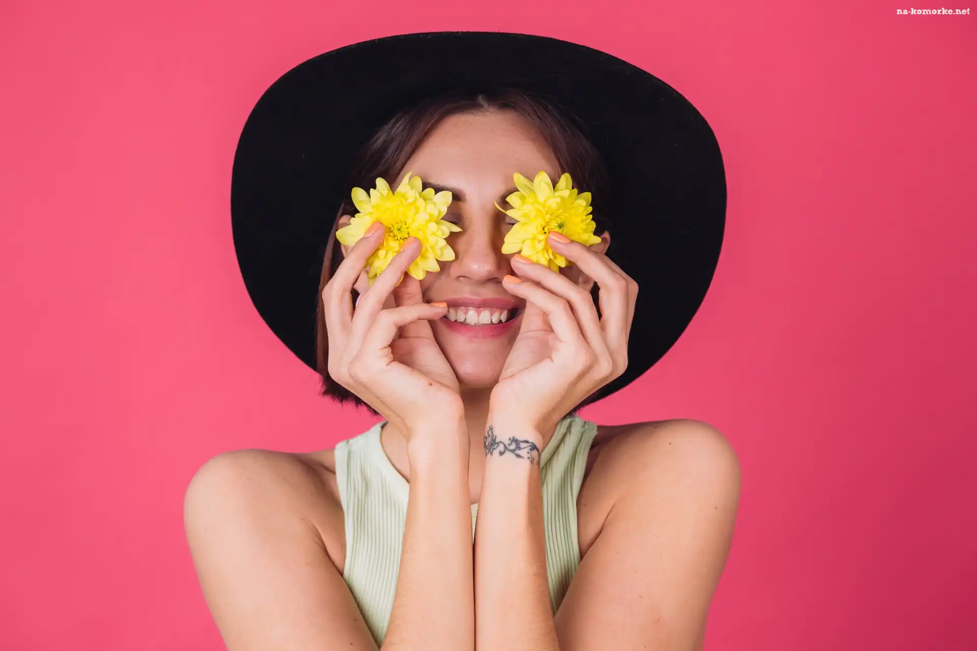 Kobieta, Kwiatki, Kapelusz, Twarz, Zakryte, Oczy, Żółte na Komórkę