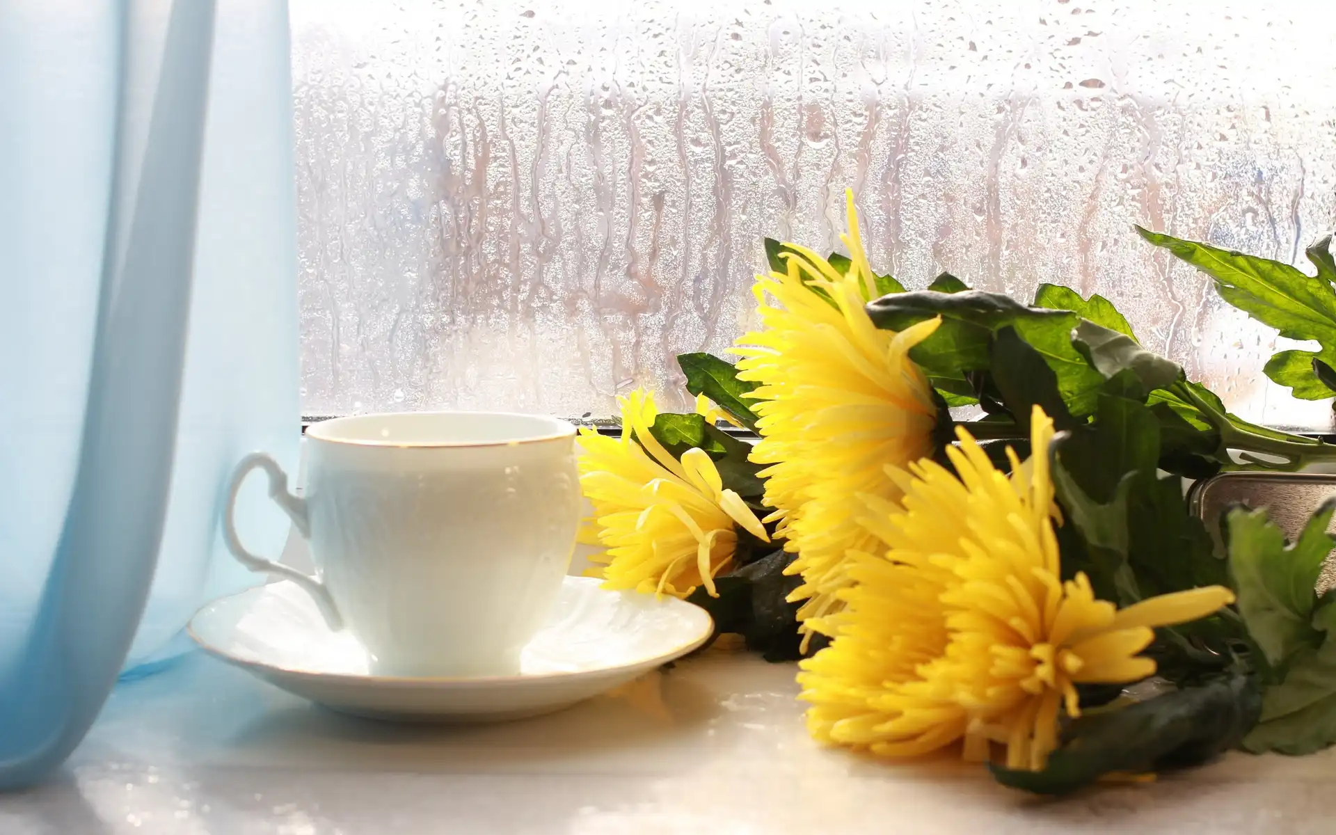Kwiatów, Herbaty, Filiżanka, Deszcz, Bukiet, Okno na Komórkę