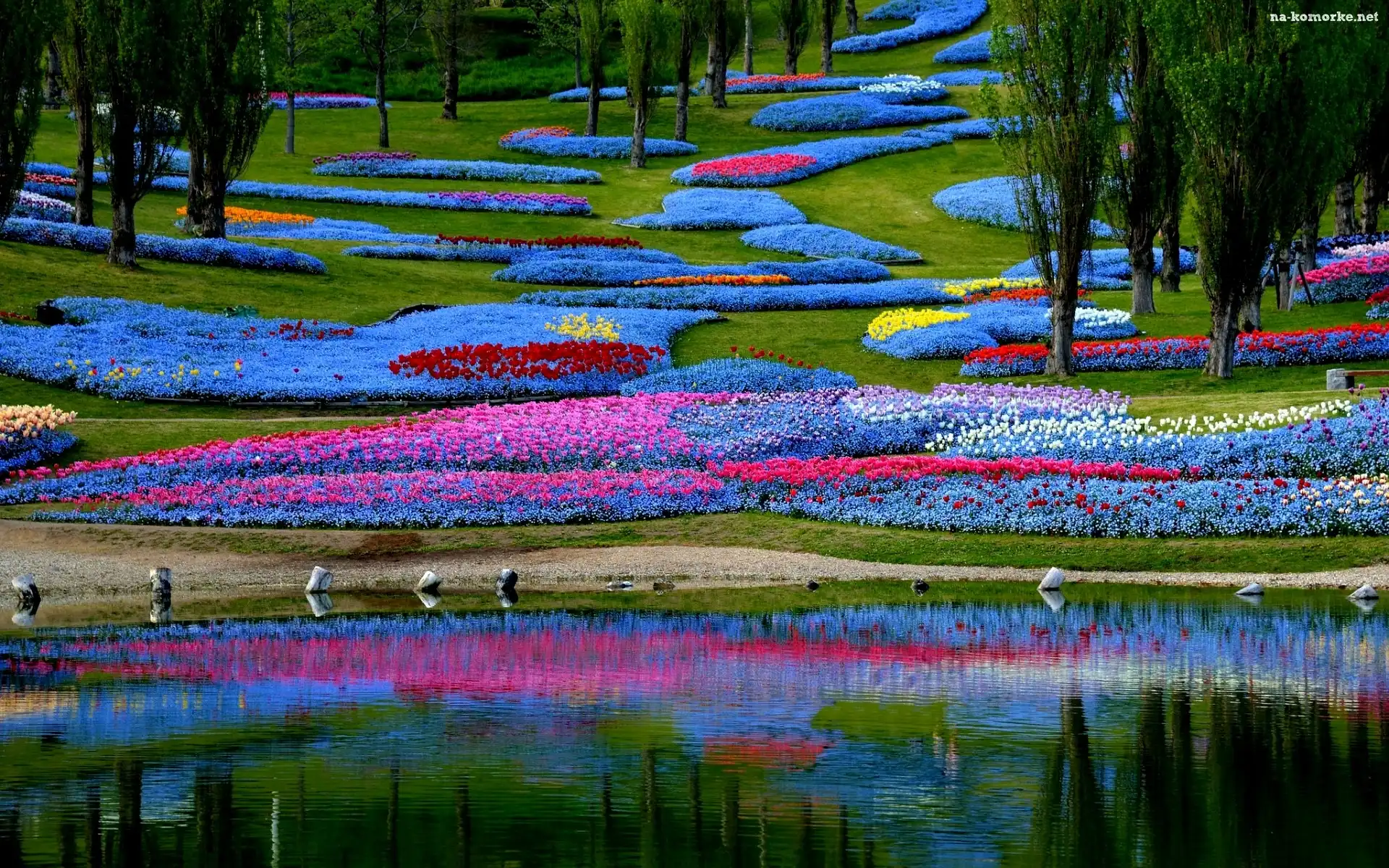 Kwiatów, Kolorowe, Park, Wiosna, Klomby, Staw na Komórkę