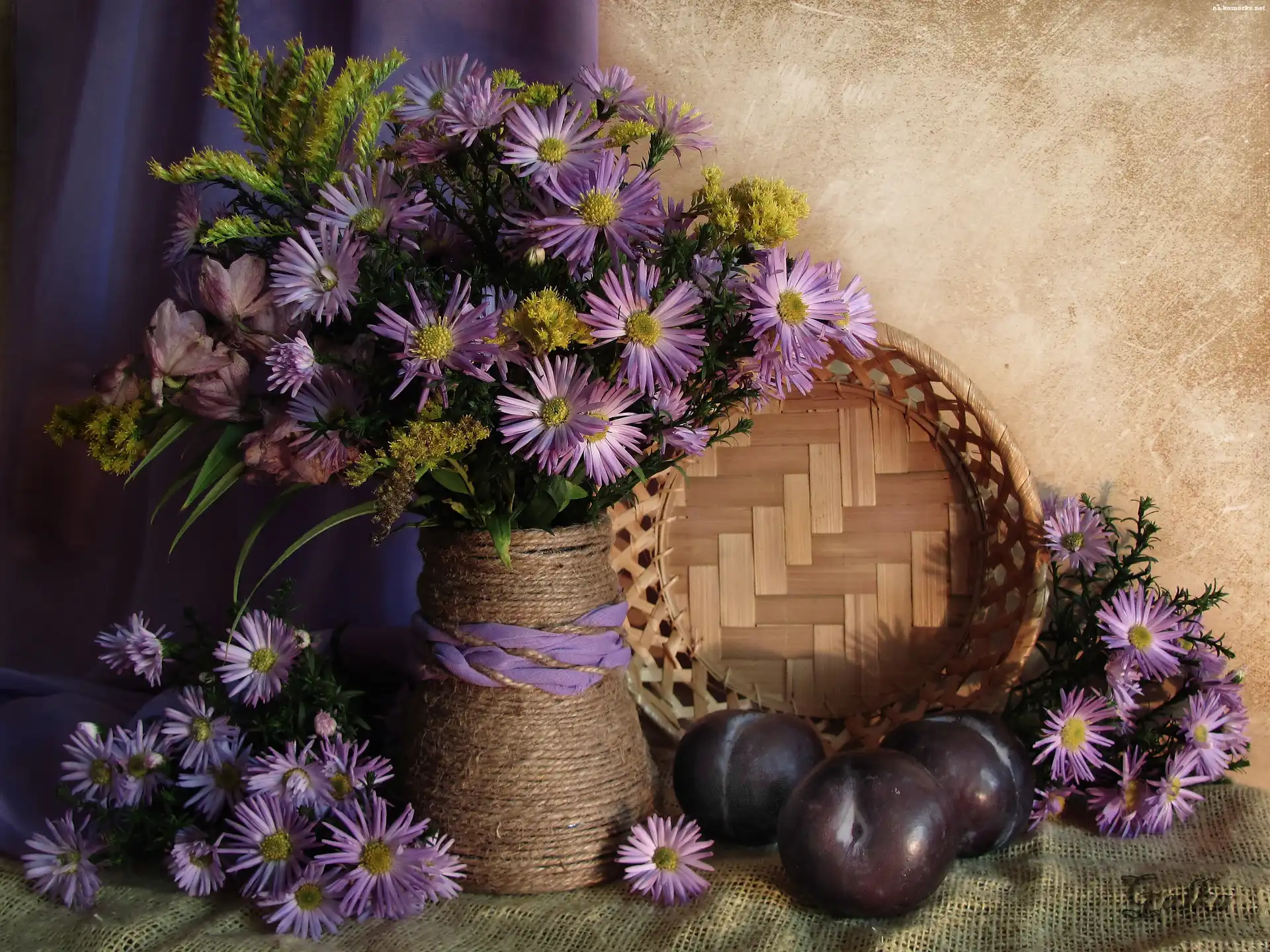 Śliwki, Miska, Serwetka Drzewo, Śliwki, Liście Kwiat Fioletowa, Werbena Śliwki, Owoce, Winogrona, Kosze, Stół Kwiaty, Przestrzeń Fioletowe, Kwiatki Biały, Zawilec Czerwona, Róża, Grafika Żółty, Kwiatuszek Miseczki, Śliwki, Dziki, Bez, Gałązka Punica, Granatu, Granatum, Kwiat Żółto, Pomarańczowy, Tulipan Koszyk, Renklody