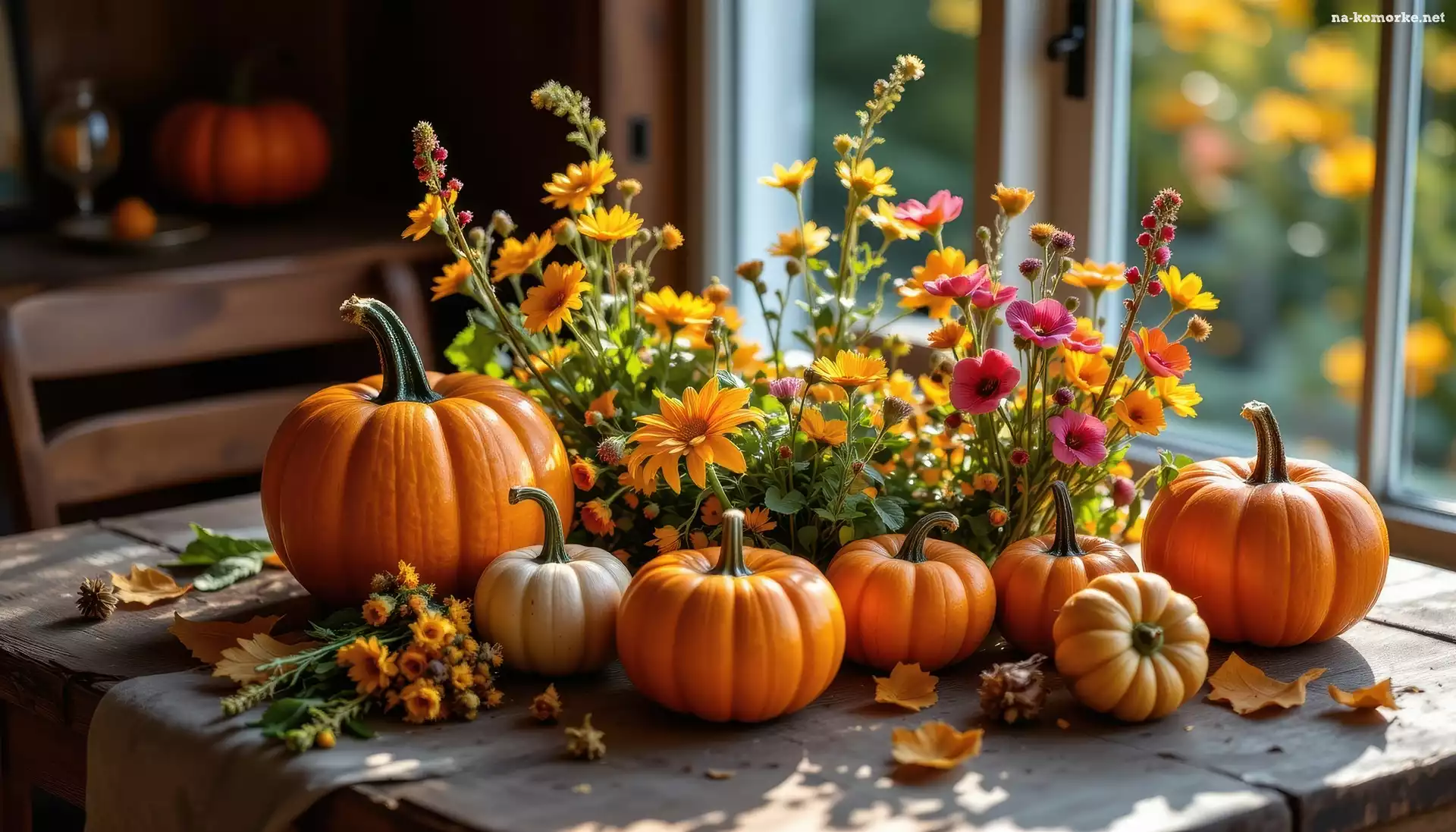 Dynie, Stół, Okno, Kwiaty, Grafika AI na Komórkę